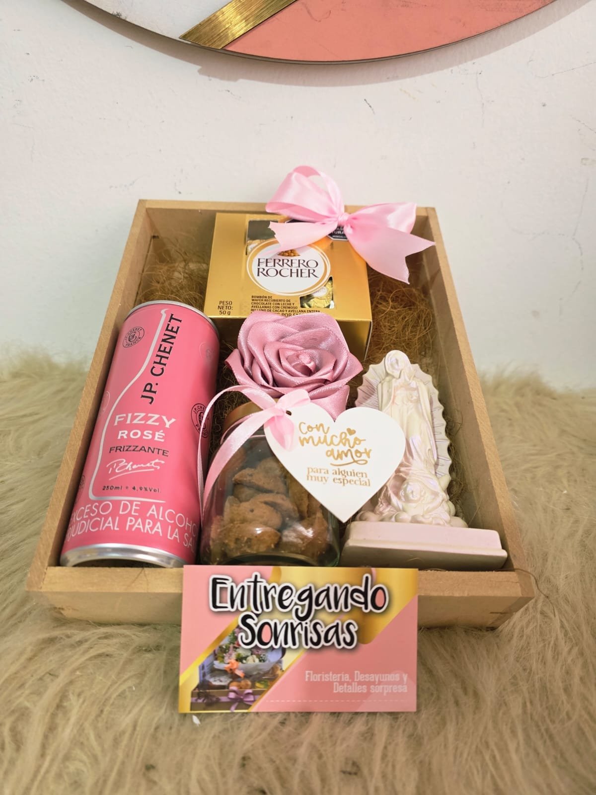 Un regalo elegante y lleno de significado para sorprender en el Día de la Mujer. Este hermoso detalle incluye una virgen pintada, frasco de galletas con chips de chocolate, deliciosos chocolates Ferrero Rocher y un cóctel JP Chenet. Además, se acompaña con una rosa eterna, tarjeta de la ocasión y una elegante caja de madera decorada. Un detalle perfecto para expresar admiración, cariño y gratitud en un día tan especial. 🌹✨